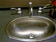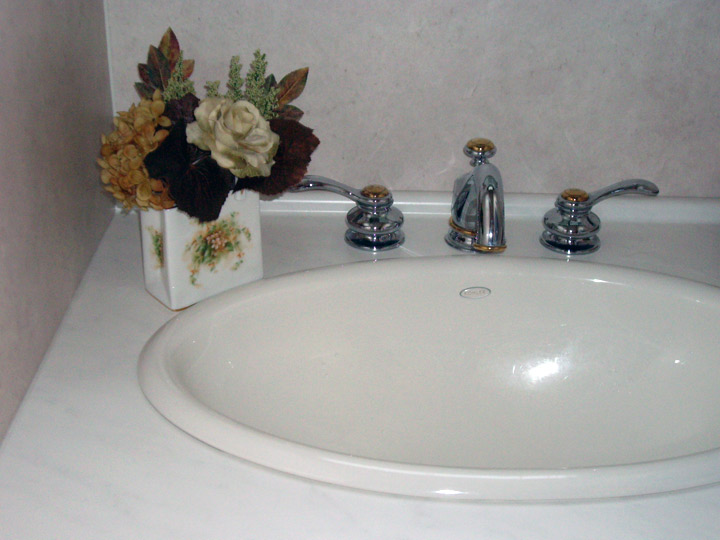 ・大理石モザイクタイルのカウンターに、ガーランドラバトリー、アンティークフォーセット。