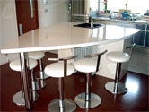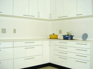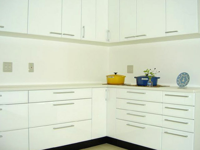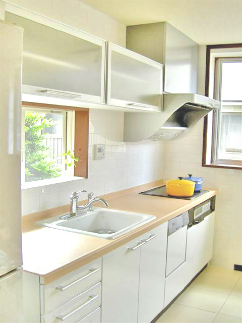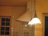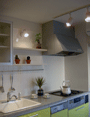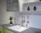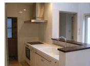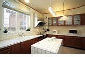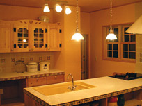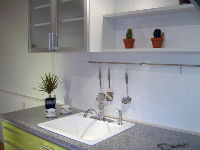 アンライムカラーのキャビネット、天然御影石のカウンターにKOHLERのシンク。スポット照明でスタジオ風キッチンの出来上がり。エアロビのインストラクターの奥様にぴったりのキッチンになりました。