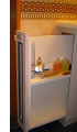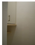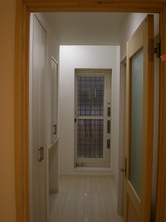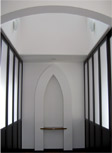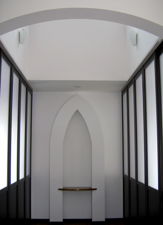 玄関のドアを開けると、真っ白な壁が目に飛び込んできます。正面の飾り棚は教会の雰囲気を漂わせます。