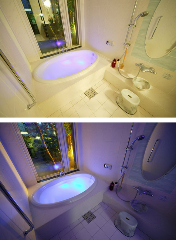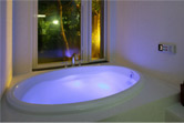 バスタブに浸かって庭を眺める水中照明でリラックス効果も抜群。