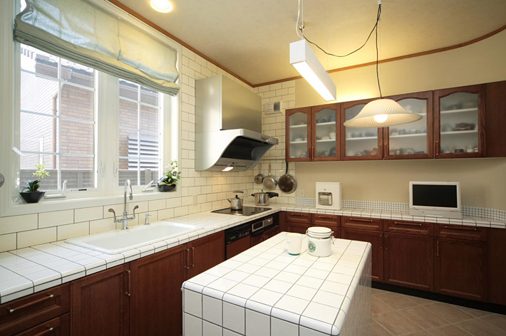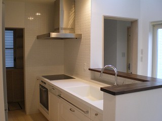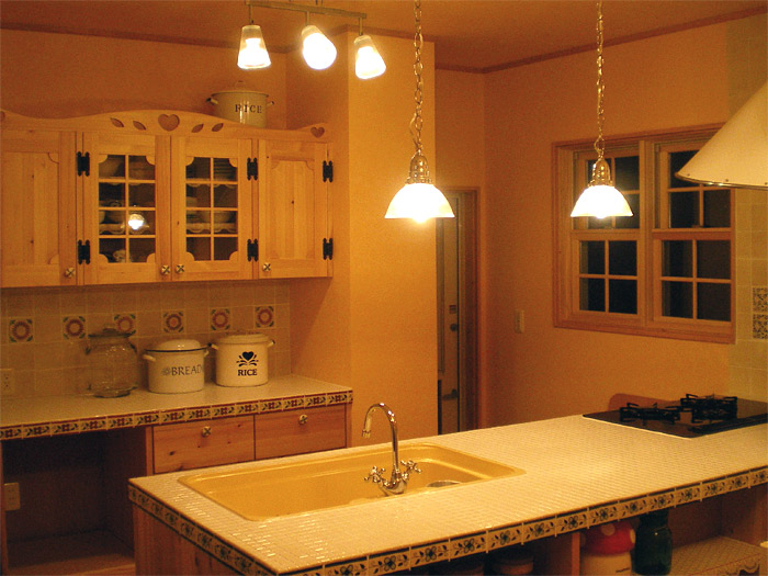 奥様の夢を叶えるメキシカンタイルのキッチン。パインウッドで造りました。