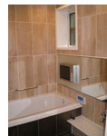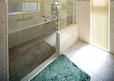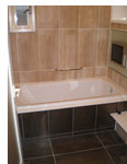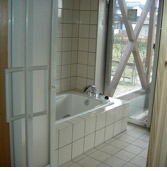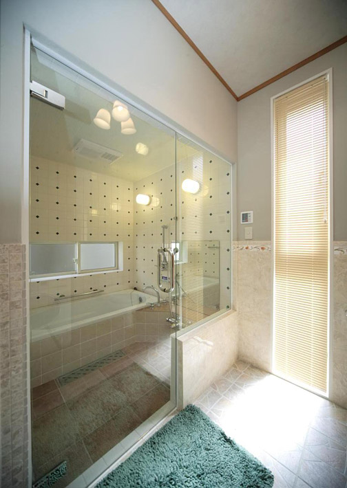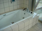 ・白に青のドットを組み合わせたタイルの壁はKOHLERの白いバスタブによく映えます。