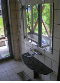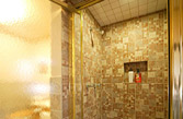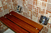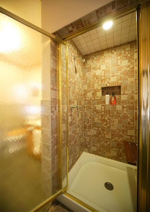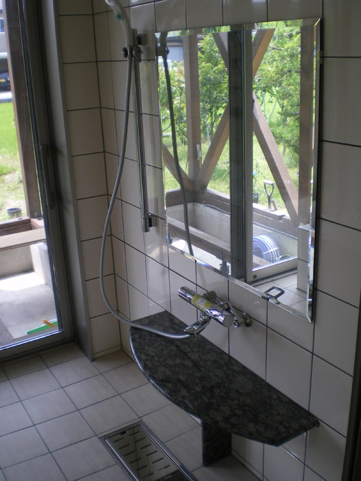 ・シャワールームもゆったりできる工夫がされています。美しいタイルの壁に合わせたニッチのシャンプー台、折りたたみチェアー、ブラス枠のシャワードアで更に高級感が高まります。