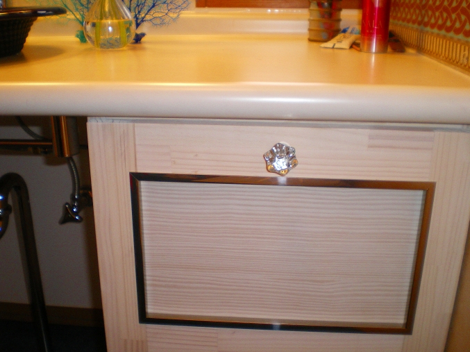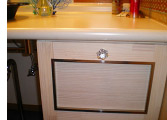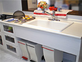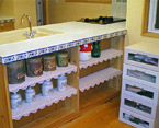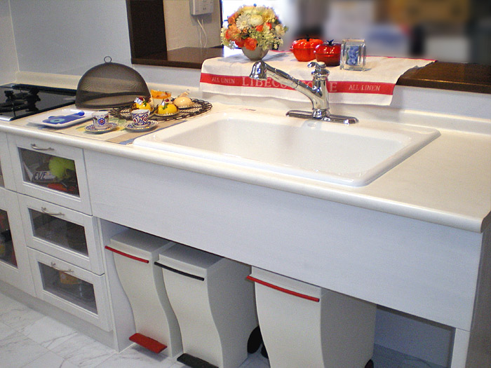 シンク下をオープンにしてゴミ箱を収納し、開放的なキッチンになりました。引き出しはオシャレなクリアのアクリル板を使用しました。