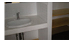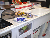 ・白い家に映えるホーローシンク、美しいフォルムのフォーセット、白いタイル。
