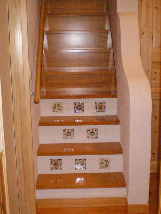 階段、壁のニッチにもメキシカンタイルを使用し、おしゃれな仕上がり。