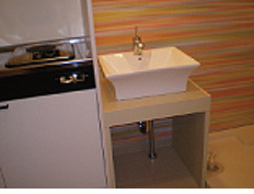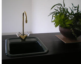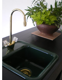 バーカウンターのシンクは、落ち着いたグリーンのシンクを使用し雰囲気を出しています。