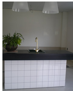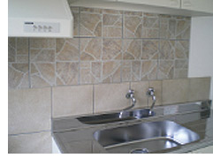 *キッチンのフード下も床と同じ大きなタイルを貼って高級感も演出。